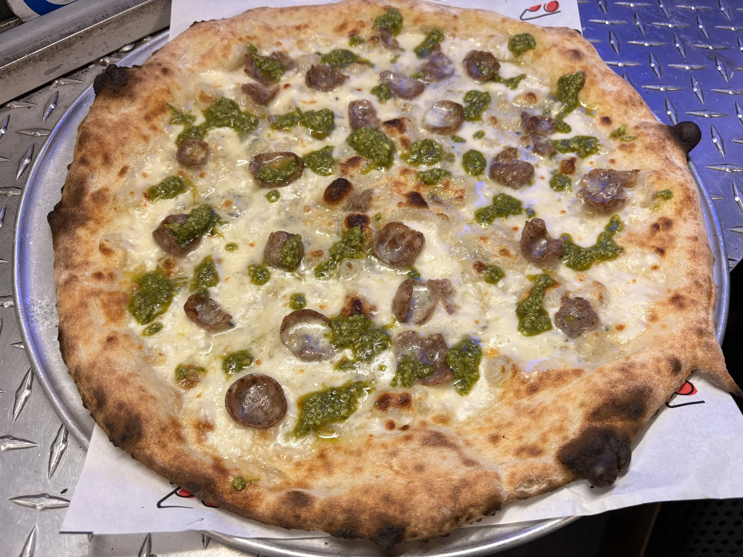 Fresh mozzarella, sausage, gorgonzola, pesto sauce