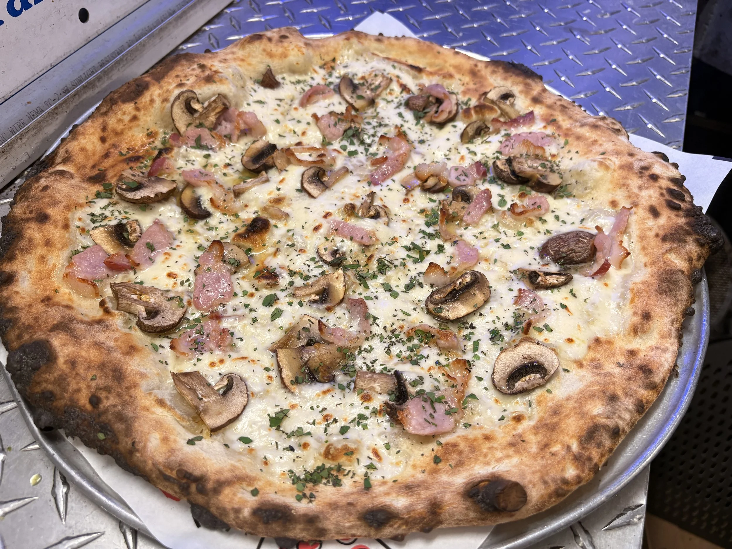 Fresh mozzarella, mushrooms, bacon, truffle oil